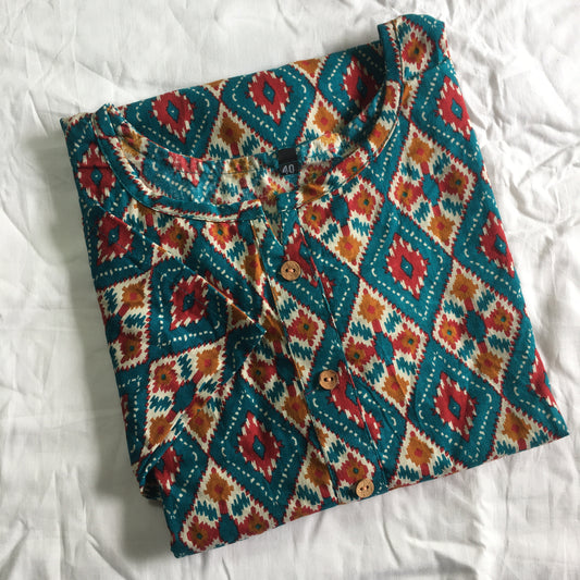 4 tone Print - Pure Cotton - Short Kurti - Firozi