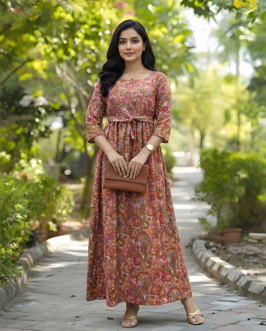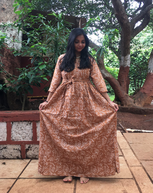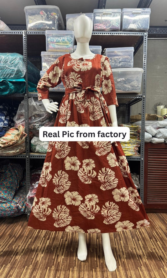 Rose Print - Brown - Maternity Kurti with Feeding Zips - Cotton Flex - Thicker Fabric