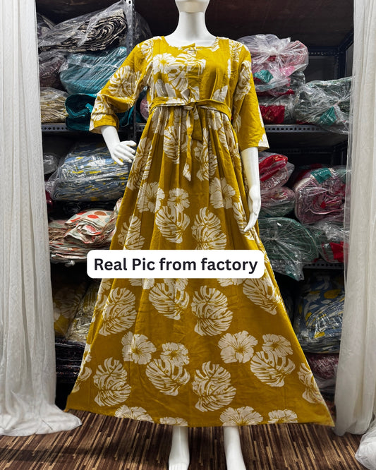Swiss Cheese Leaf Yellow - Maternity Kurti with Feeding Zips - Cotton Flex - Thicker Fabric