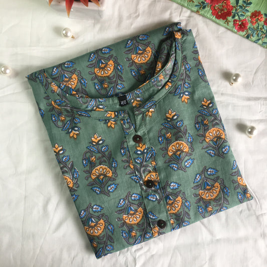 Sea Green Daisy - Maternity Kurti with Feeding Zips - Cotton Flex - Thicker Fabric