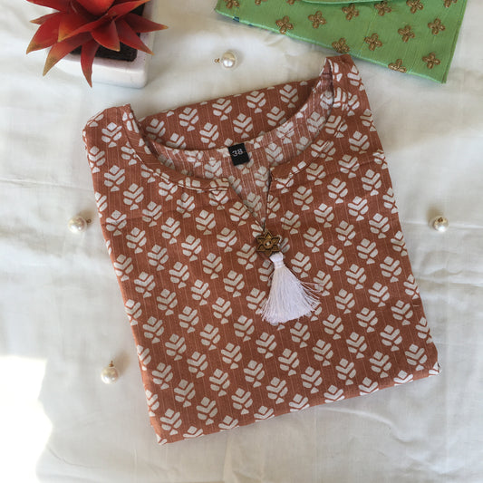 Pure Cotton - Short Kurti - Leaf Print - Light Brown