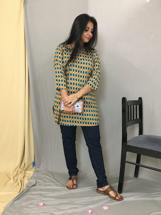 Sea Green Orange Honey Print Short Kurti - Pure Cotton