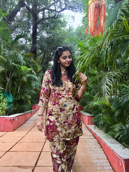 Maroon Grey Flower - Cord Set - Soft Rayon