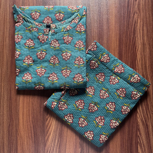 Katha Work - Green Brown Flower - Cord Set - Pure Cotton