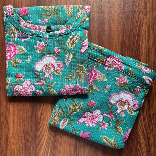 Katha Work - Green Pink Flower - Cord Set - Pure Cotton