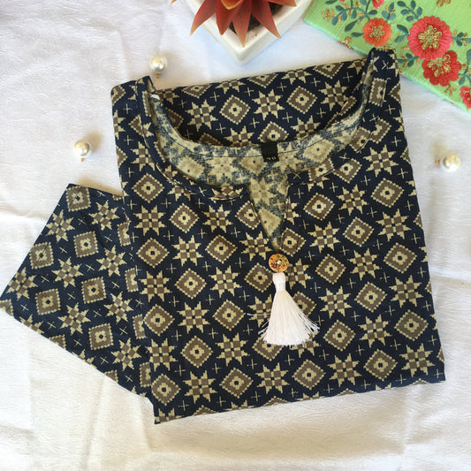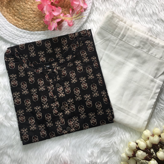 Black Cream Ajrakh - Cord Set - White Pant - Pure Cotton
