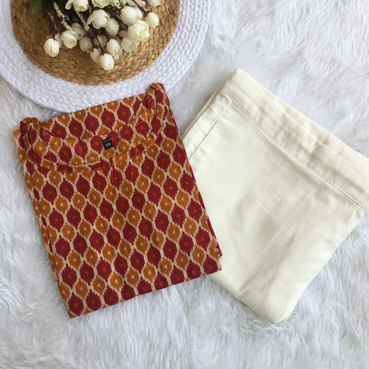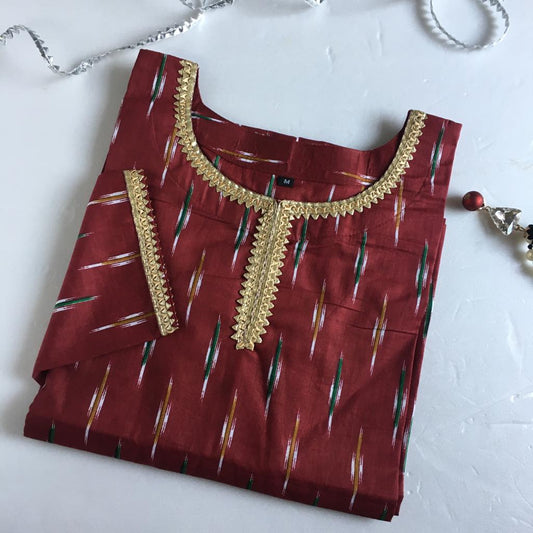 Maroon Ikkat Golden Lace - Knee Length - Cord Set - White Pant - Pure Cotton