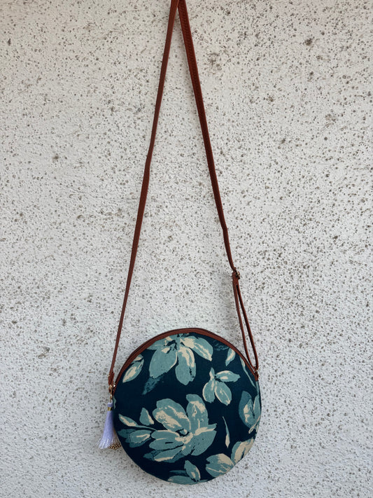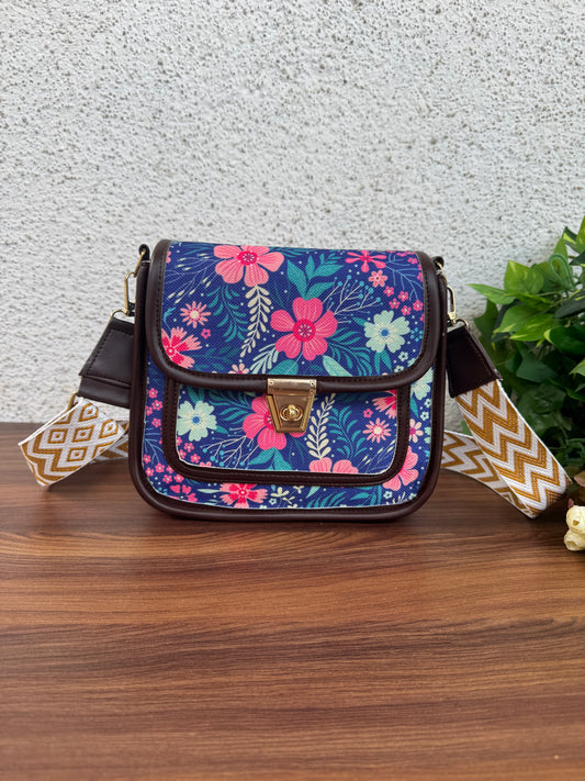 Feista - Blue Pink Flower - 4 Zips - pockets sling bag with Aztec Belt