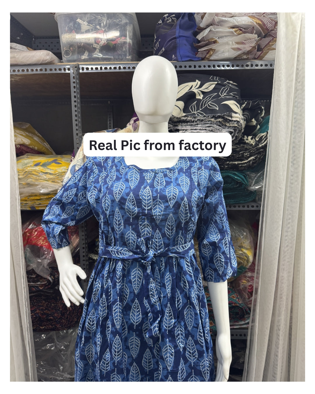 Blue White Leaves - Maternity Kurti with Feeding Zips - Cambric Cotton