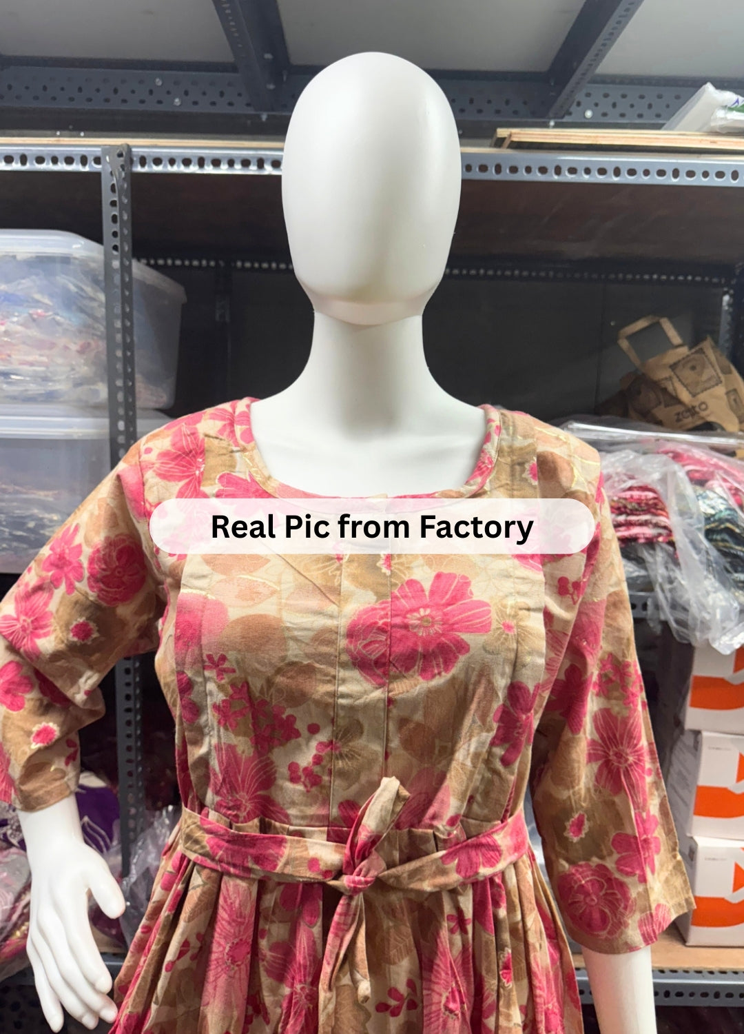 Daisy Baby Pink & Brown - Maternity Kurti with Feeding Zips - Cotton Flex - Thicker Fabric