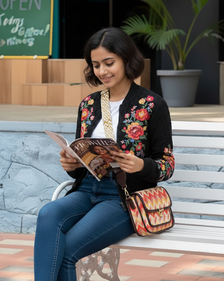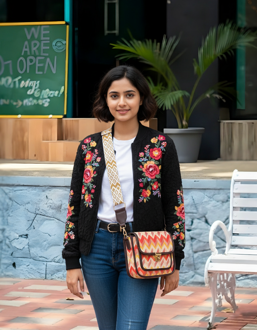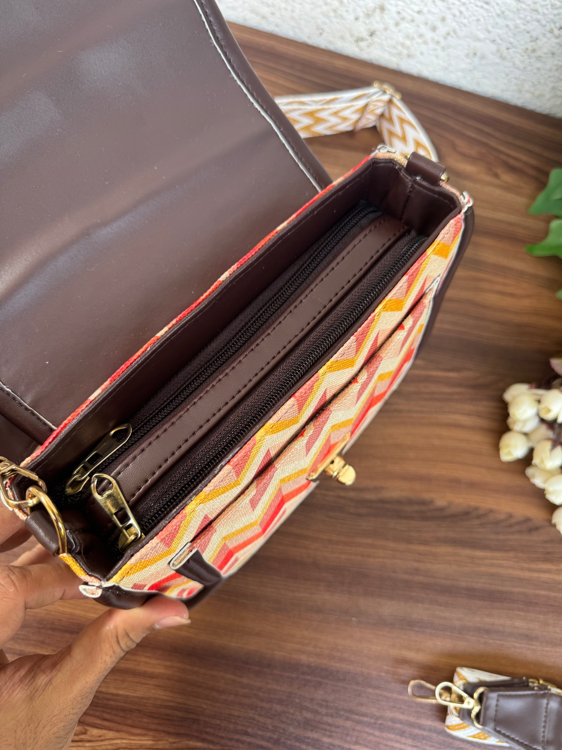 This chic and compact sling bag is your new go-to accessory for staying organized on the move. The vibrant, patterned flap and statement strap add a trendy touch to any outfit.