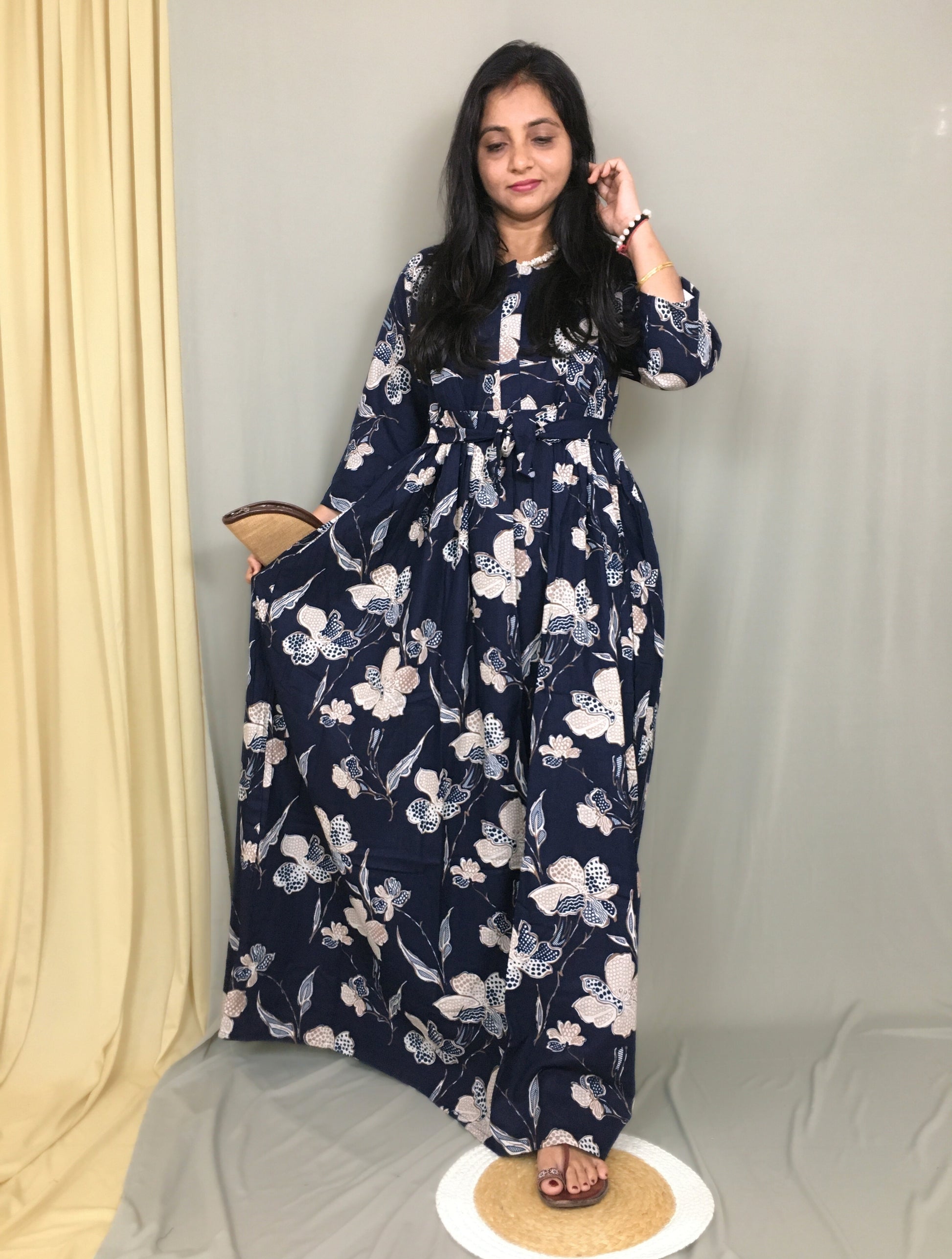 Flower & Leafs - Navy Blue - Maternity Kurti with Feeding Zips - Cotton Flex - Thicker Fabric