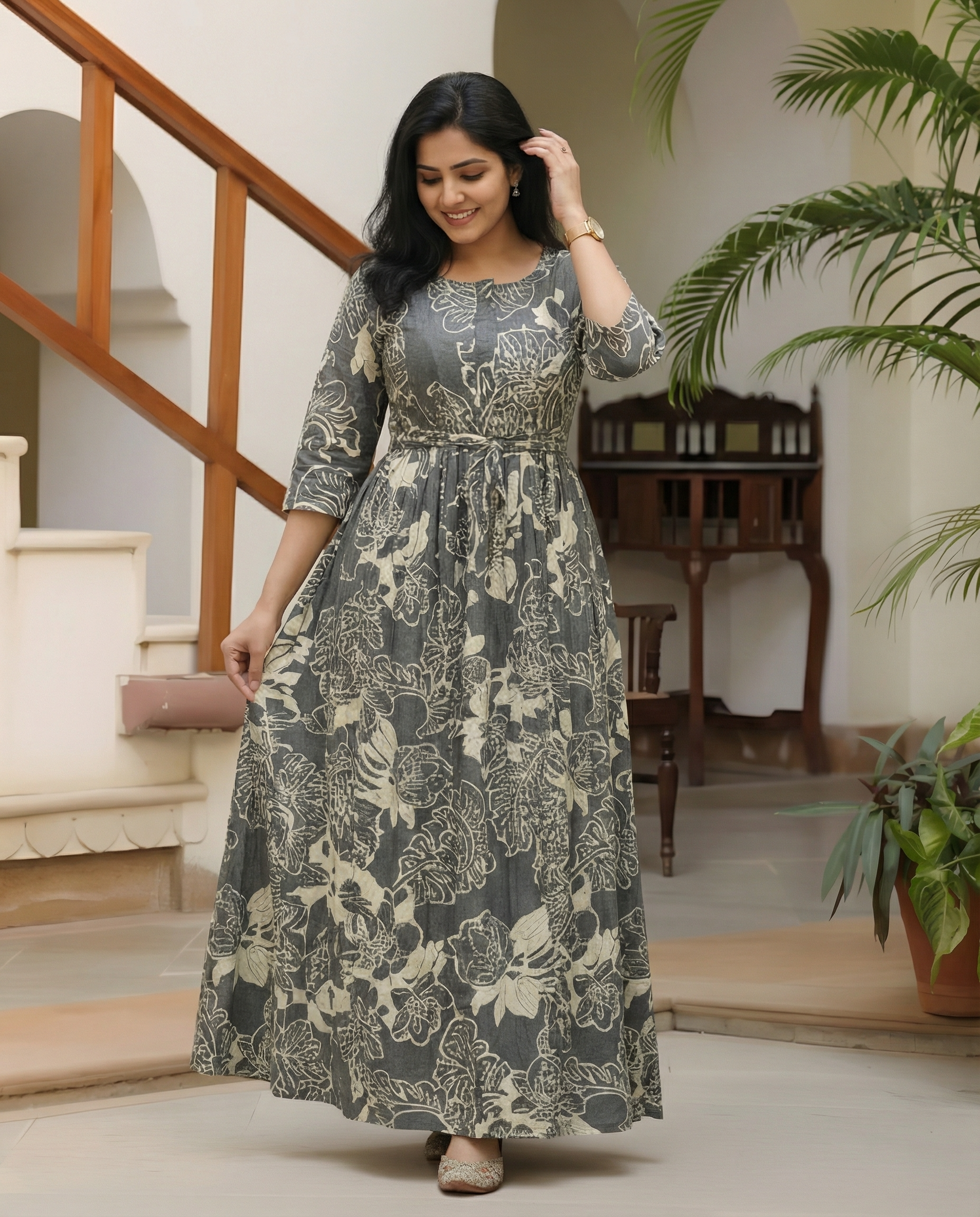 Grey White Big Flower - Maternity Kurti with Feeding Zips - Soft Rayon