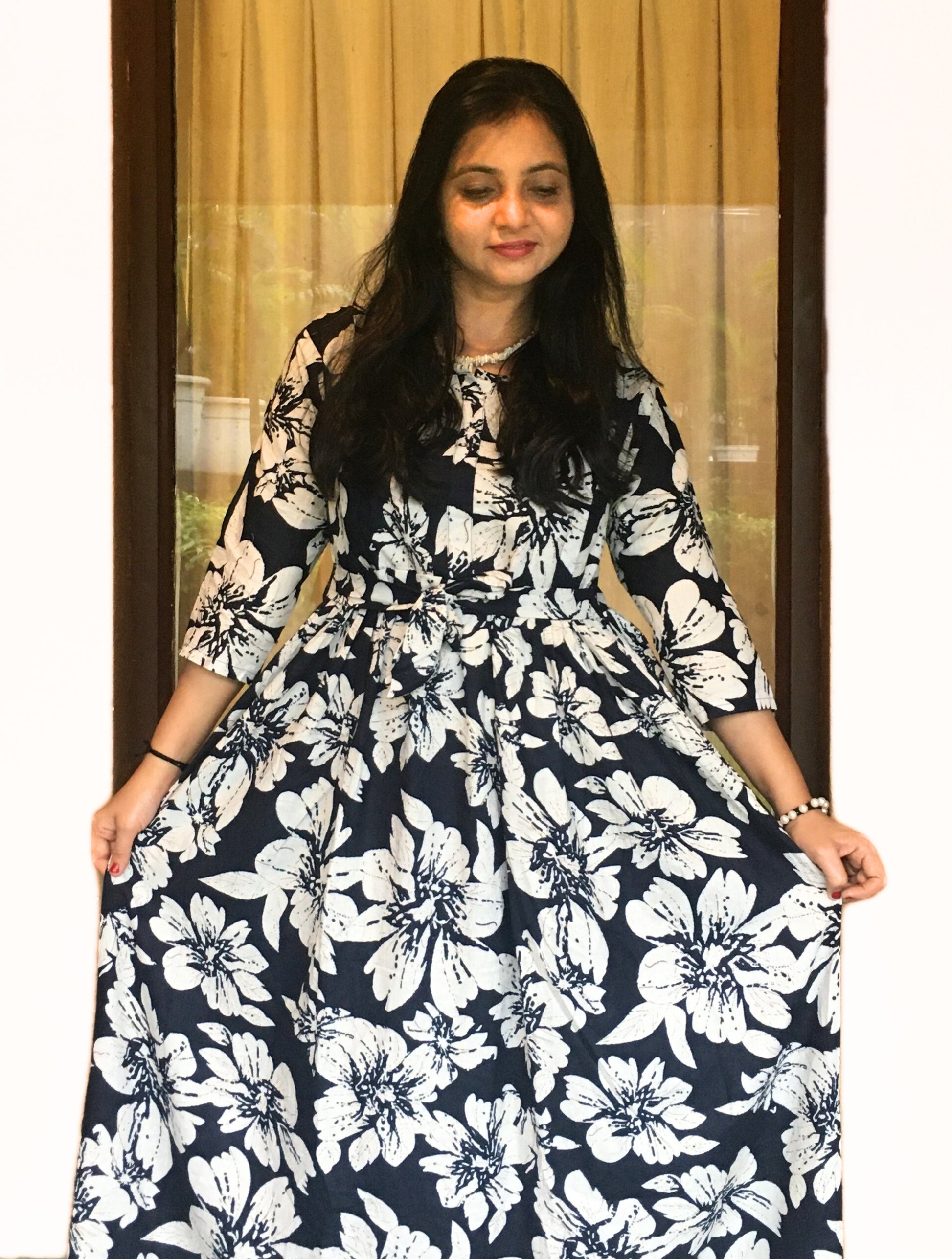 Hibiscus - Navy Blue - Maternity Kurti with Feeding Zips - Cotton Flex - Thicker Fabric