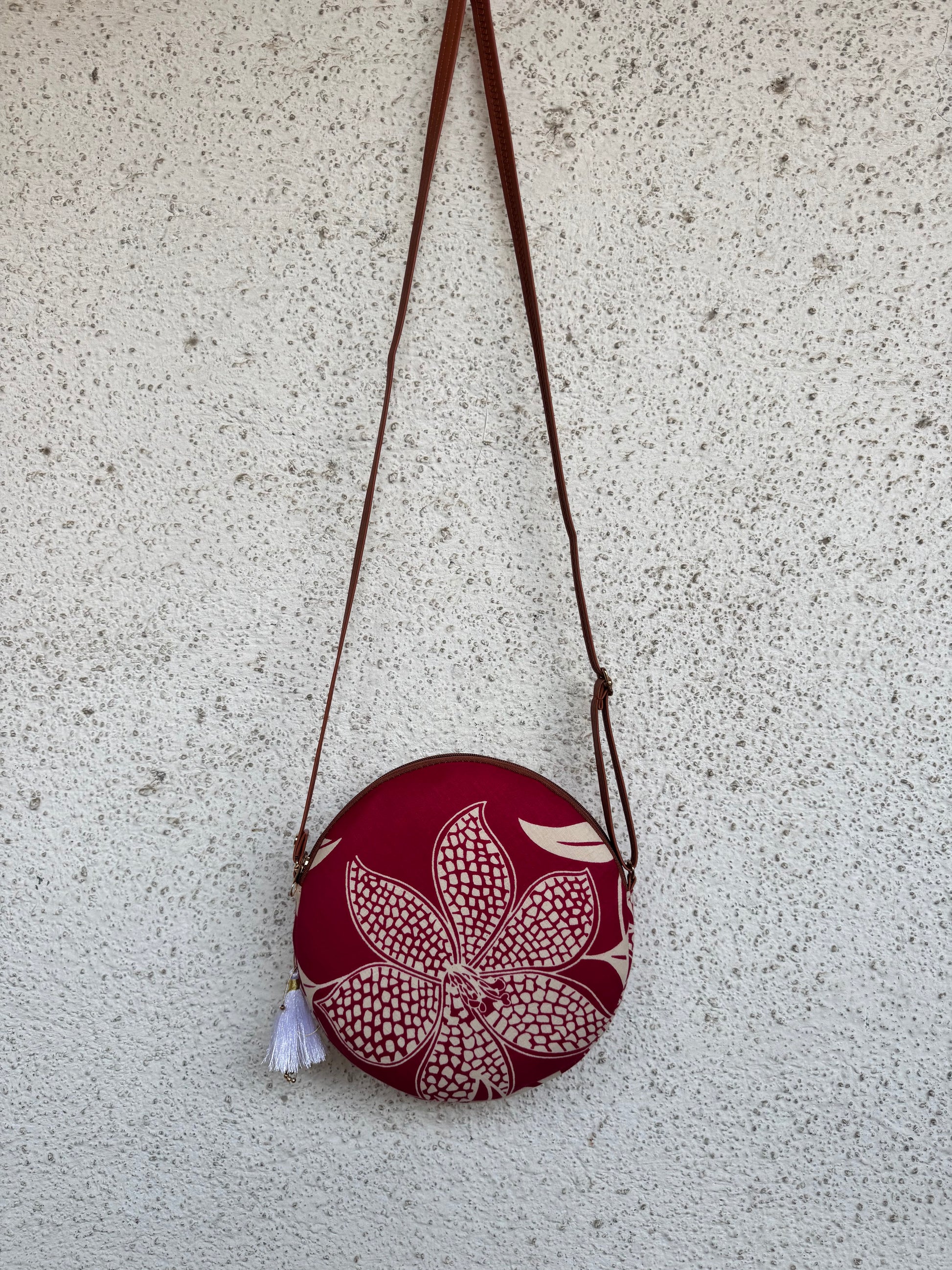 Cute and small circle shape, fusion of Cotton fabric and synthetic leather, has full too zip and back zip,