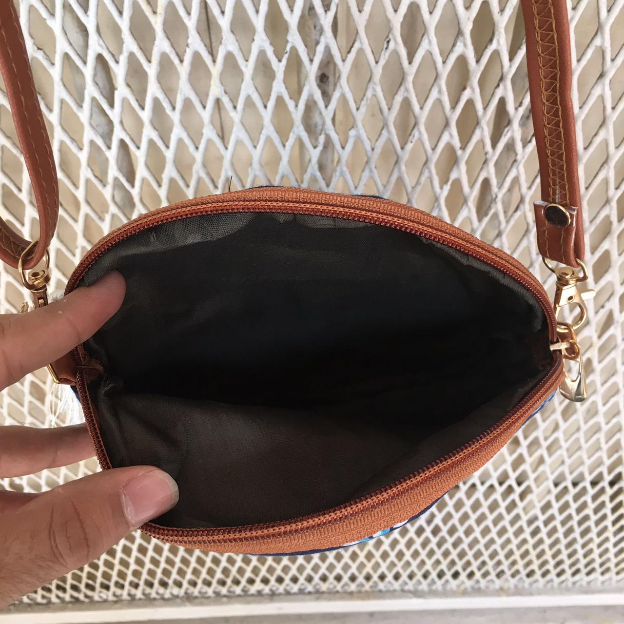 Cute and small circle shape, fusion of Cotton fabric and synthetic leather, has full too zip and back zip,