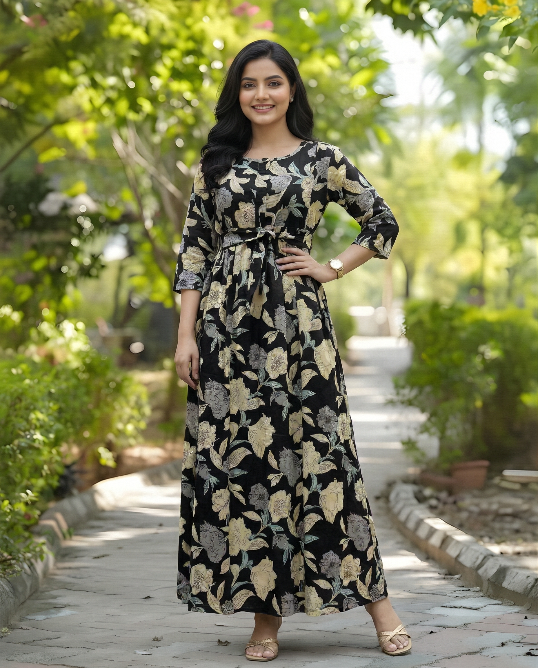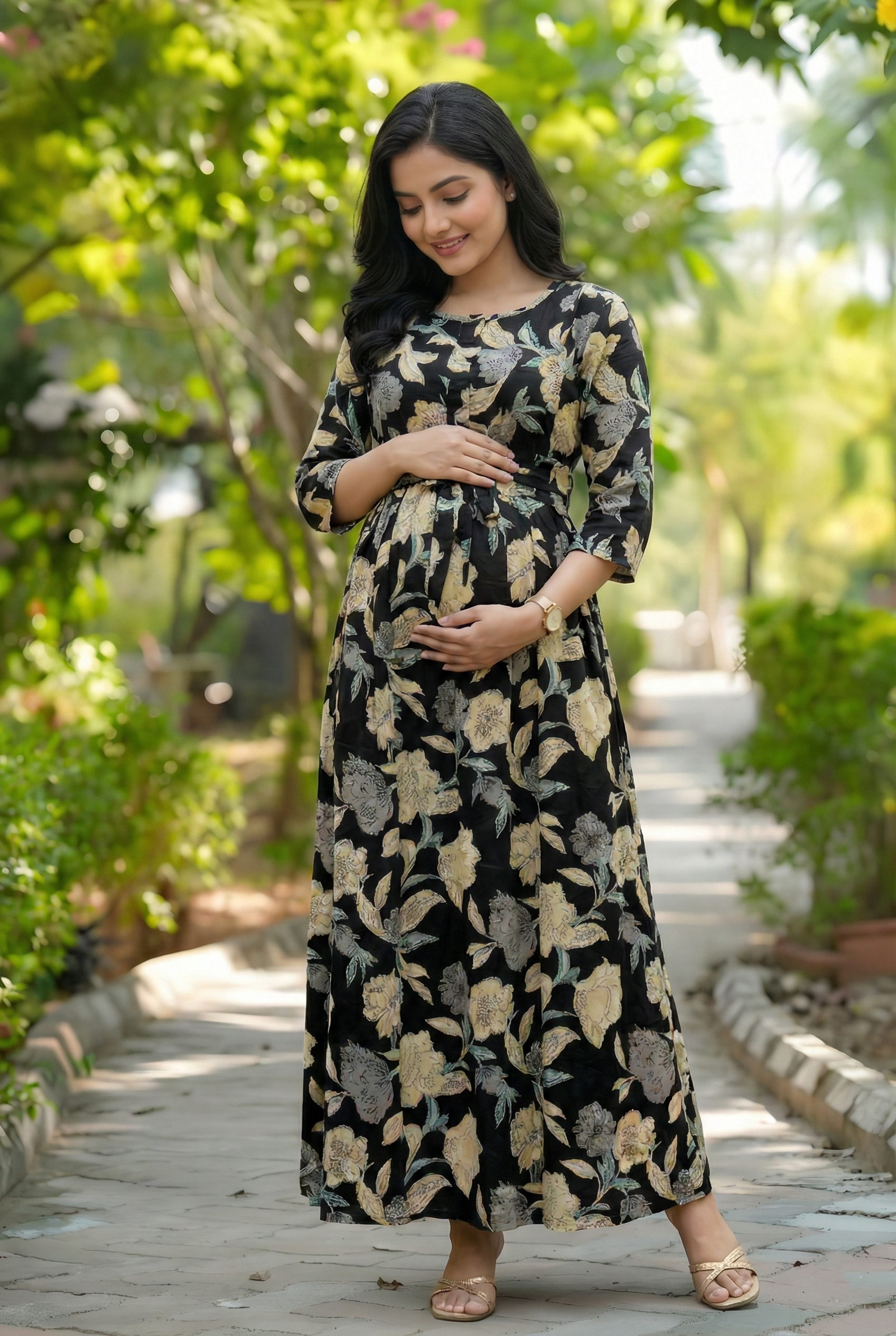 Mix Flower - Black - Maternity Kurti with Feeding Zips - Cotton Flex - Thicker Fabric